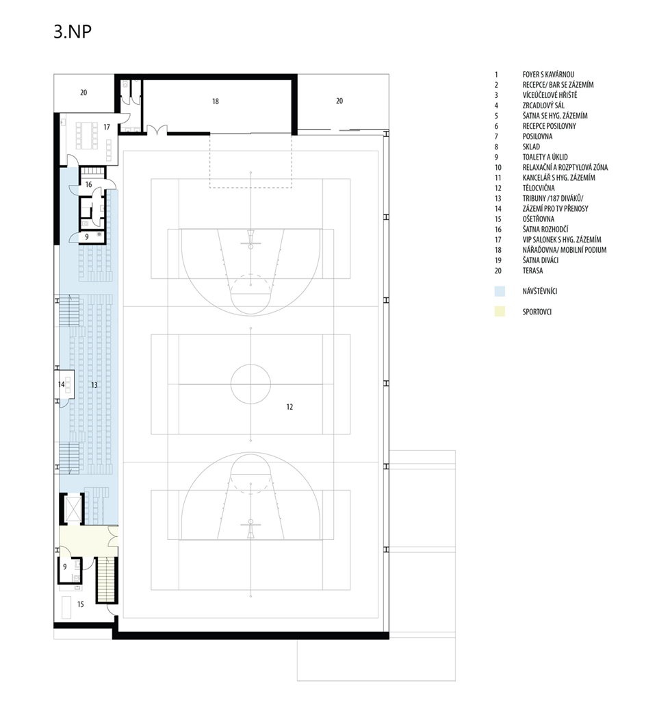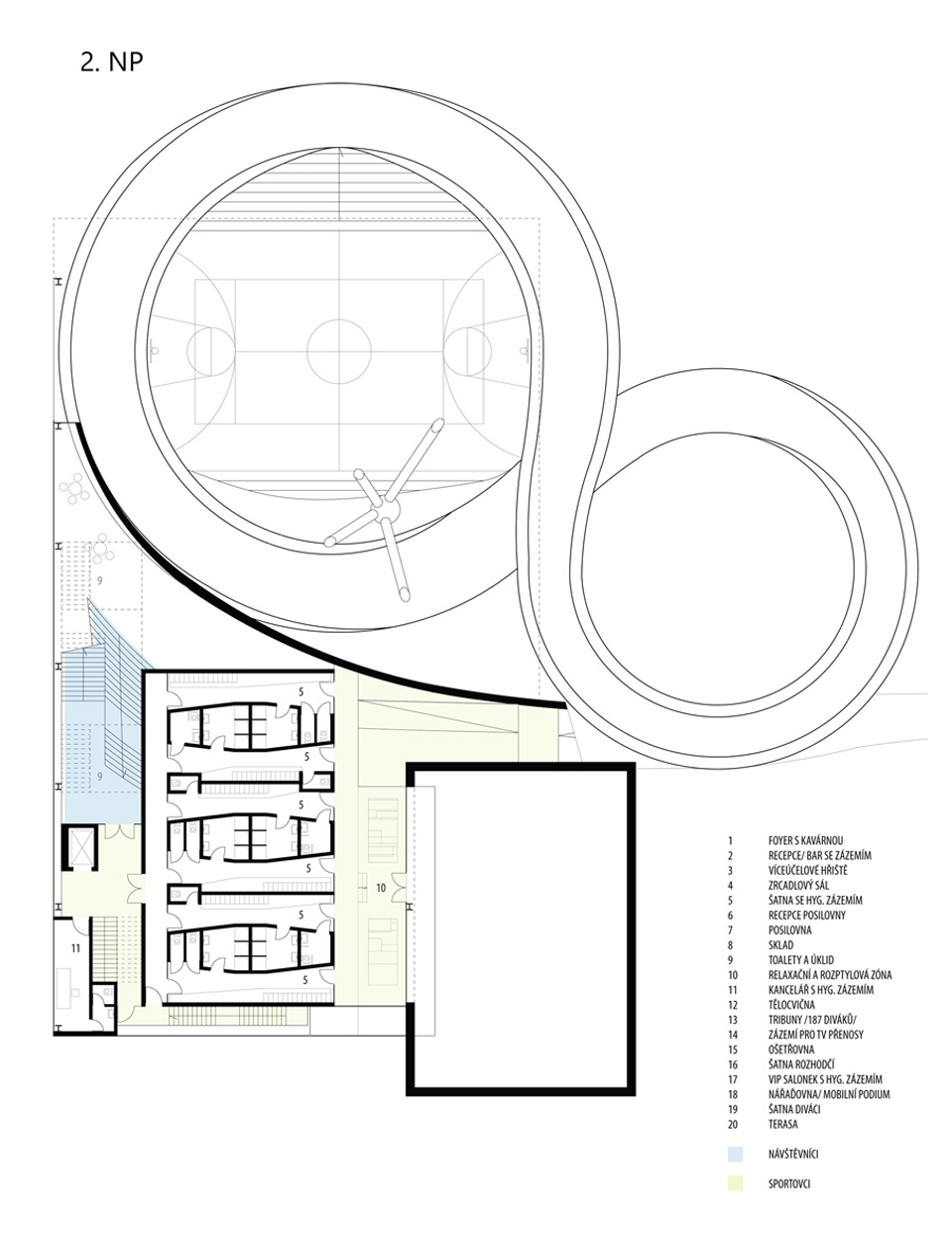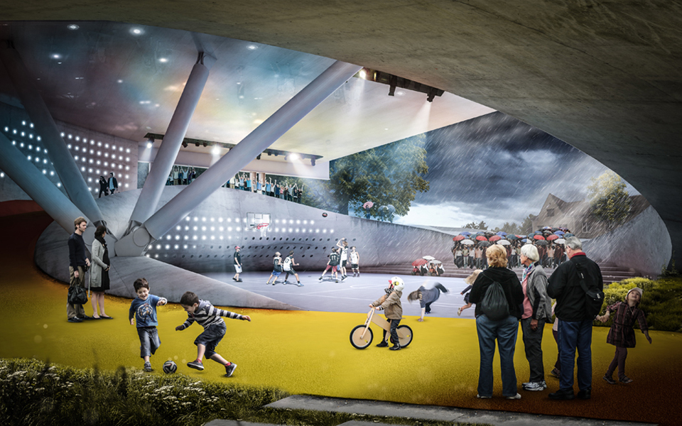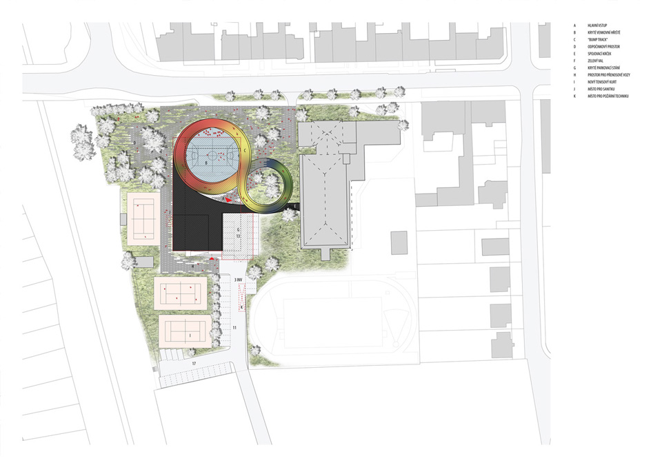 S naším návrhem přestává být SPORTOVNÍ HALA centrem aktivity pouze pro uzavřené skupiny, ale stává se interaktivním, DEMOKRATICKÝM PROSTOREM reagujícím na současné známé, ale i budoucí potřeby všech obyvatel Modřic. Prostor vstupu (vnější AGORA/ HŘIŠTĚ) se stává NEJVĚTŠÍM ZASTŘEŠENÝM VEŘEJNÝM PROSTOREM MĚSTA, místem každodenních sportovních a rekreačních aktivit a zároveň výjimečných městských akcí (festivalů, divadel, koncertů, sportovních soutěží, politických kampaní, TV přenosů atd.).
